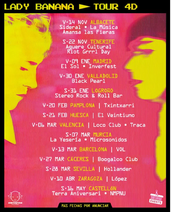 El recorrido llevará a Lady Banana a ciudades como Madrid, Albacete, Tenerife, Valladolid, Pamplona, Logroño, Huesca, Valencia, Murcia, Barcelona, Cáceres, Sevilla, Zaragoza y Castellón De La Plana, en una serie de conciertos donde su nuevo repertorio cobrará vida sobre el escenario con toda la fuerza y actitud que las define.